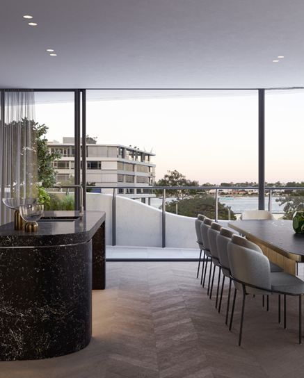 Inside, apartments echo the sweeps and arcs of Quay’s exterior, with curves adding character, while timber and tile flooring builds the connection to nature.