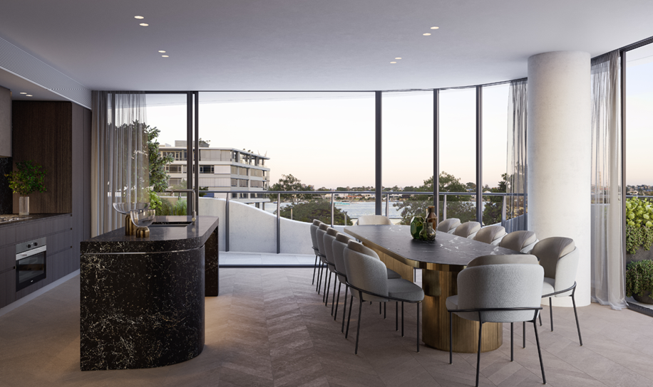 “Interiors flow to the large, sculptured balconies, framed by expansive glass frontages and high ceilings to draw in daylight and cross ventilation,” says Mr Wiener.