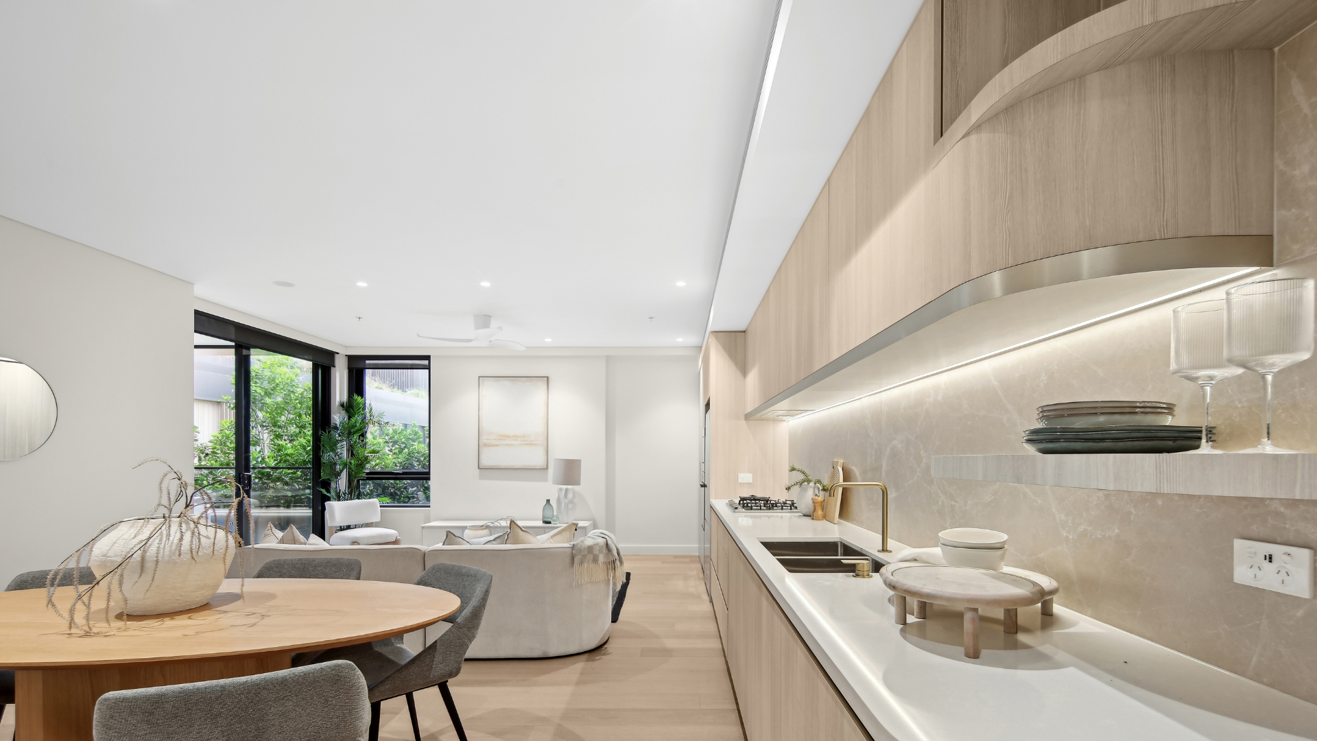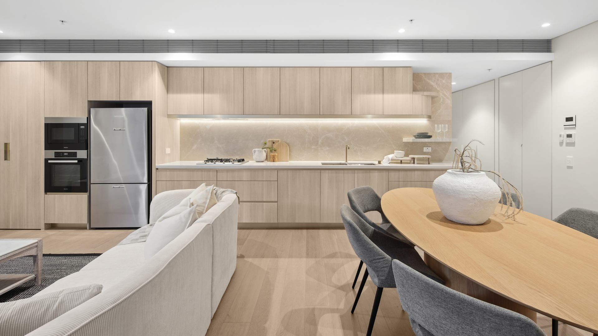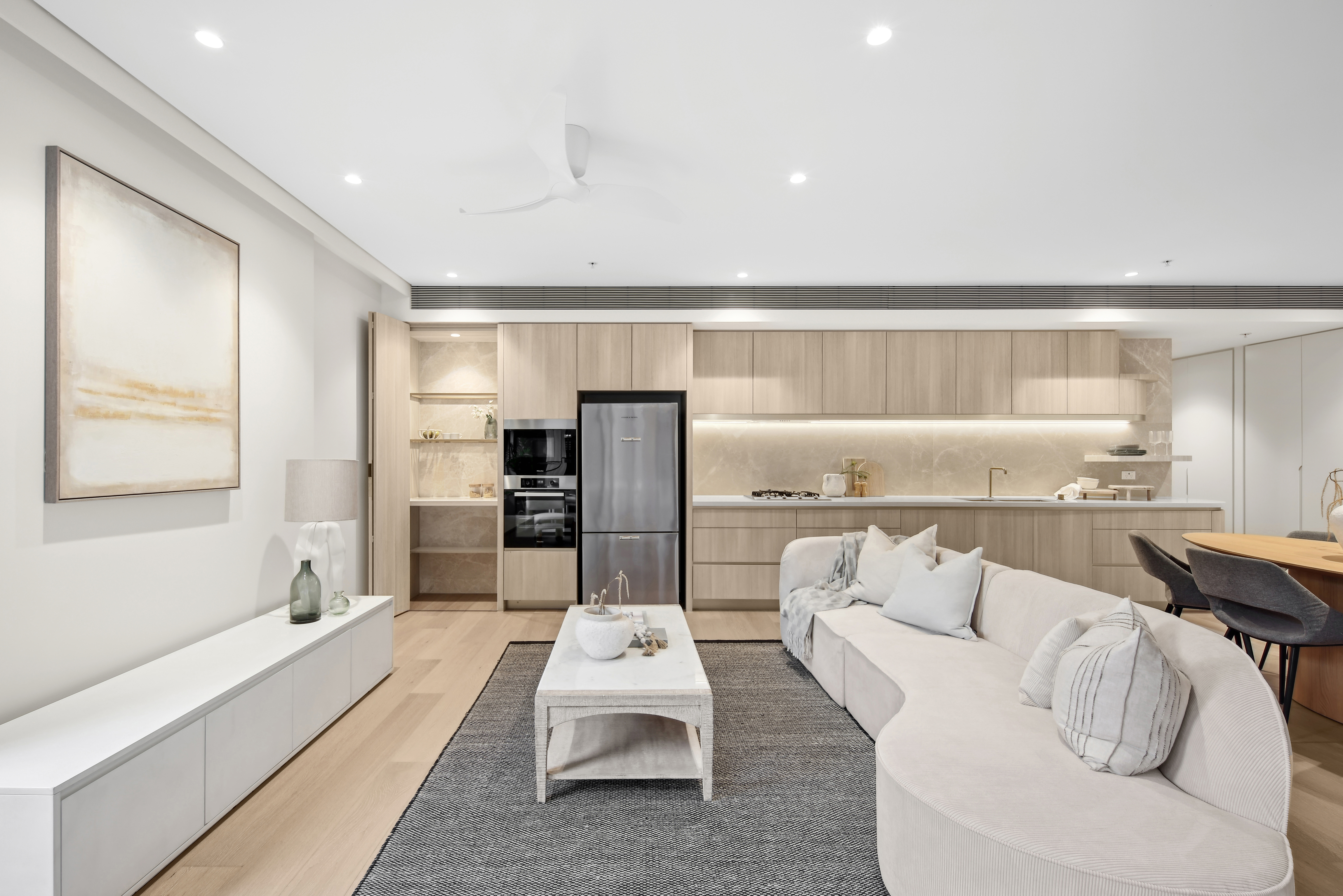 Kitchens are fitted with Miele appliances, timber flooring,  natural stone splashbacks and timber look joinery with thoughtful inclusions such as an open pantry with glazed display shelving and natural stone to enable residents to personalise their home.
