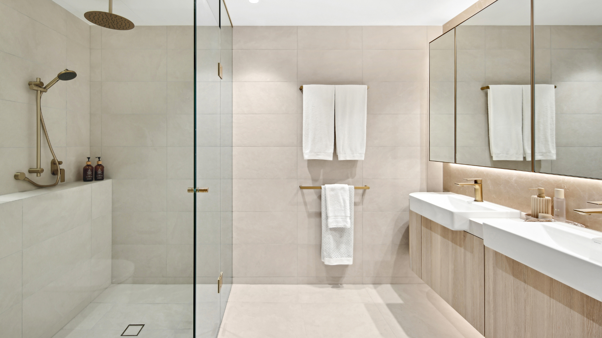 Bathrooms are designed for indulgent pleasure with an overlay of practicality, mixing easy to maintain tiles with natural stone, timber laminate and lighting features.