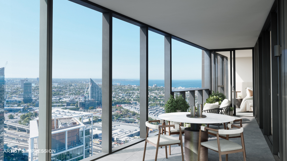 Artist's impression was produced prior to planning approval, statutory approval and commencement of construction and is subject to change. The information, image and artists' impression depicting interiors and exteriors are intended only as a guide and are not to be relied on as representative of the final product or the apartment type advertised. Furnishings are not included. Views depicted in this property listing are indicative only at approximately Level 35 and should not be relied upon as representative of any final views from any particular apartment. Purchasers should make their own enquiries as to the impact of any proposed surrounding development on any views. Photography is correct as at August 2022 and does not represent any future development that may occur in the area. The information provided herein is believed to be correct as at May 2025.