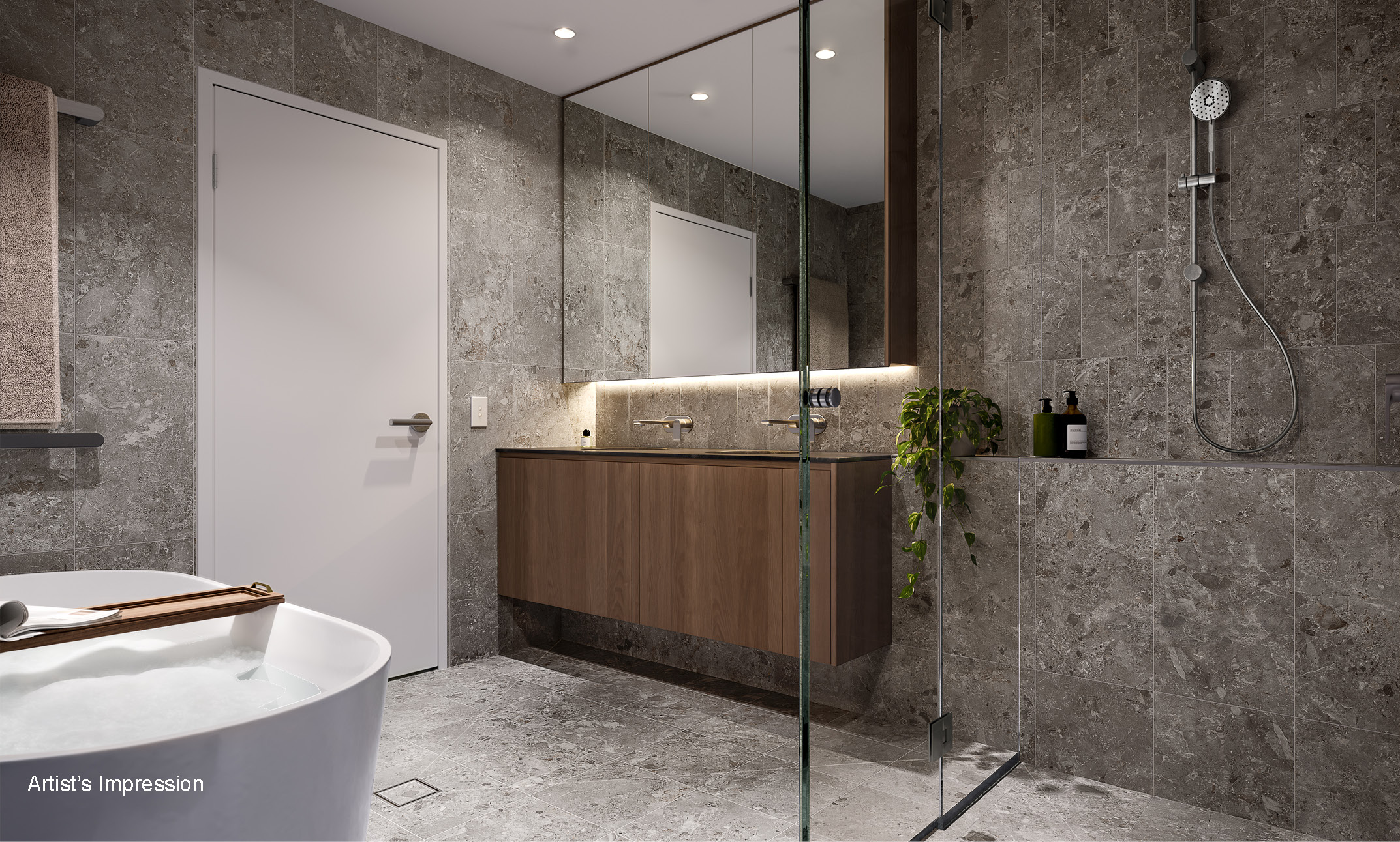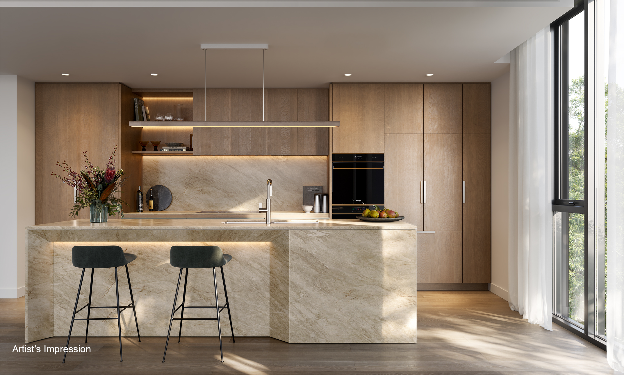 *Artist's impression as at 28.03.2024 was produced prior to receipt of all final planning approvals and prior to commencement of construction and is subject to change. The information, image and artist's impression depicting exteriors and interiors are intended only as a guide and are not to be relied on as a representative of the final product. Furnishings are not included. Artist impression shows upgraded finishes and fitting options. Speak to a Mirvac Sales Consultant for details about which finishes/fittings are upgrade items. Landscaping and other aspects of the project may differ from this image. The view depicted is not to be taken as a representation of the final view.