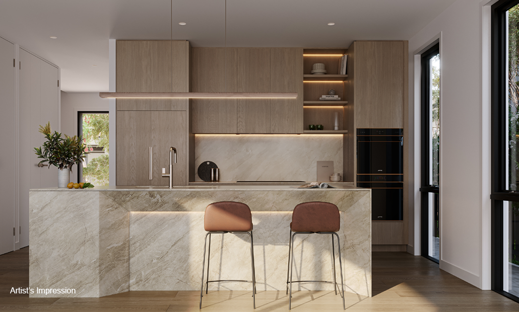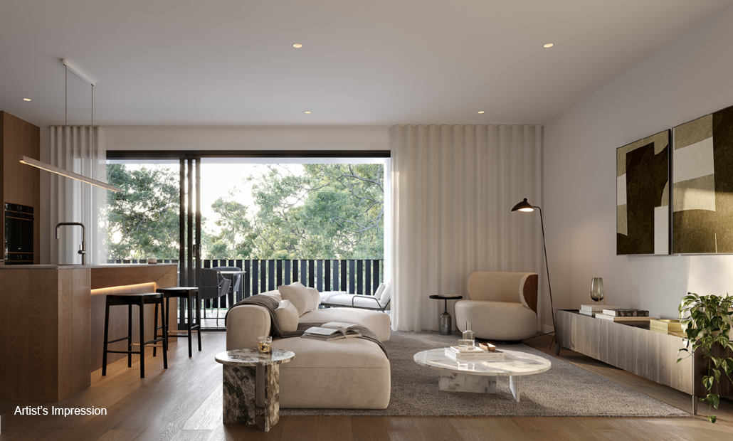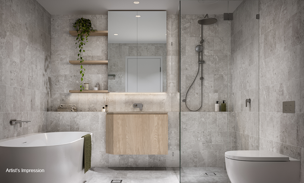 *Artist's impression as at 28.03.2024 was produced prior to receipt of all final planning approvals and prior to commencement of construction and is subject to change. The information, image and artist's impression depicting exteriors and interiors are intended only as a guide and are not to be relied on as a representative of the final product. Furnishings are not included. Artist impression shows upgraded finishes and fitting options. Speak to a Mirvac Sales Consultant for details about which finishes/fittings are upgrade items. Landscaping and other aspects of the project may differ from this image. The view depicted is not to be taken as a representation of the final view.