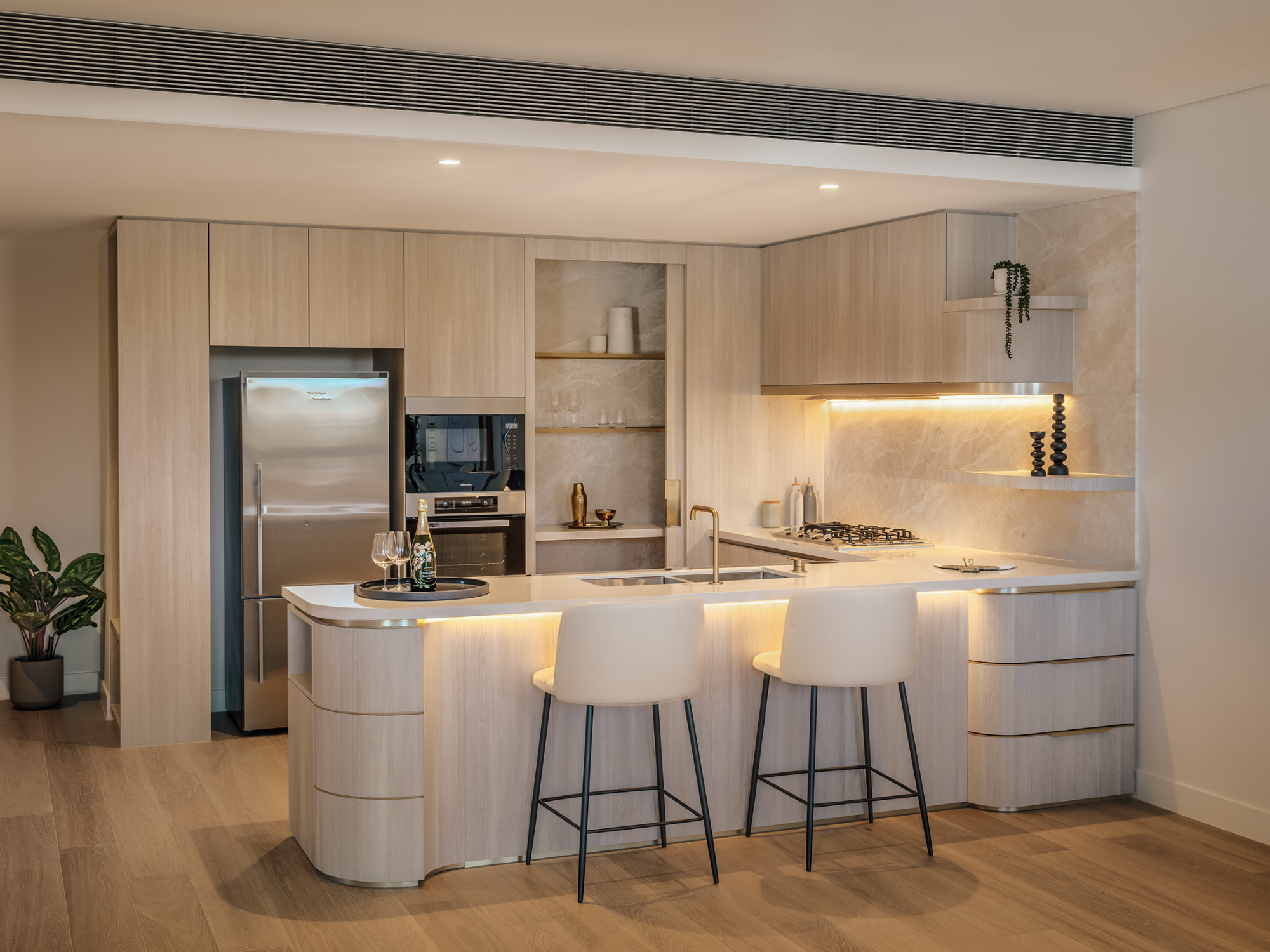 Step into this inviting two-bedroom apartment, boasting a spacious 102sqm of internal space complemented by a generous 23sqm balcony. Reflecting the beauty of the local surroundings, the kitchen showcases a light natural stone splashback and timber-look joinery, complete with Miele appliances.