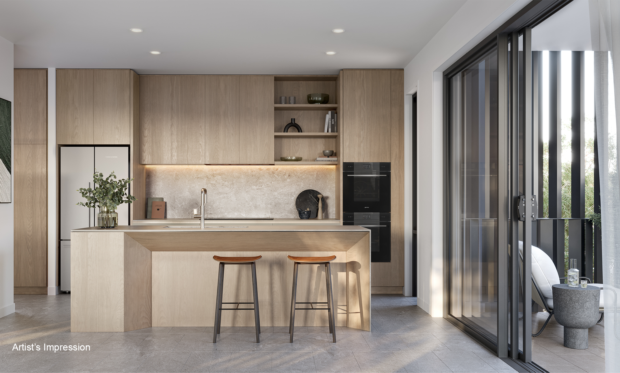 *Artist's impression as at 28.03.2024 was produced prior to receipt of all final planning approvals and prior to commencement of construction and is subject to change. The information, image and artist's impression depicting exteriors and interiors are intended only as a guide and are not to be relied on as a representative of the final product. Furnishings are not included. Landscaping and other aspects of the project may differ from this image. The view depicted is not to be taken as a representation of the final view.