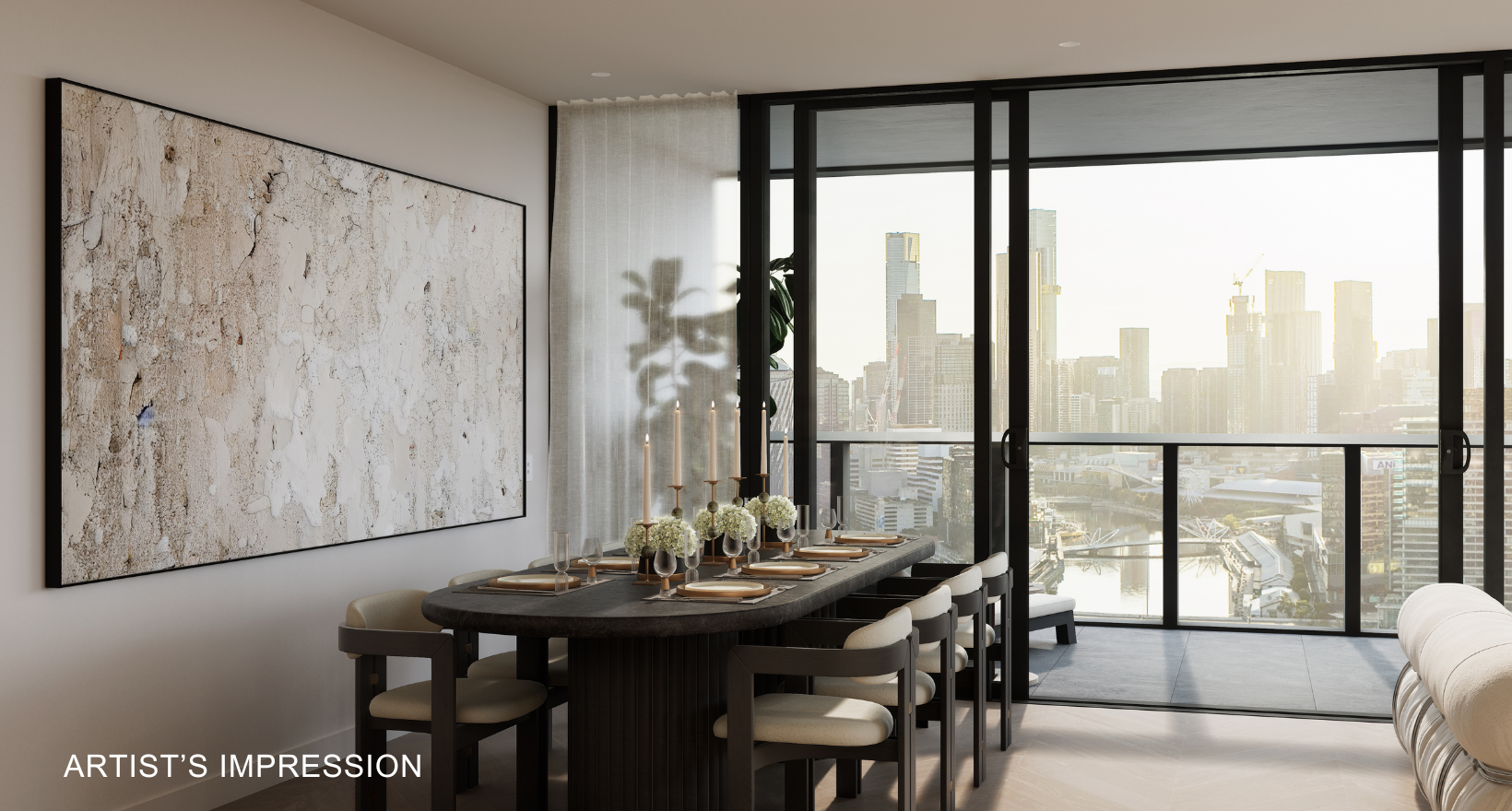 - Open plan living and dining seamlessly connects to a 22 square metre east-facing balcony with Melbourne city skyline vistas