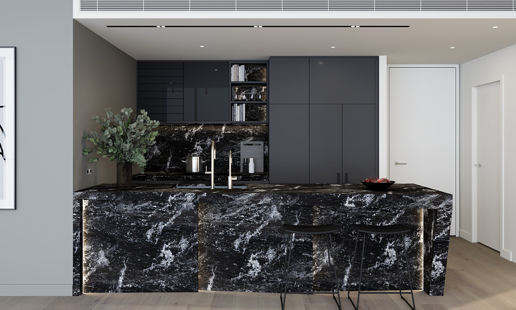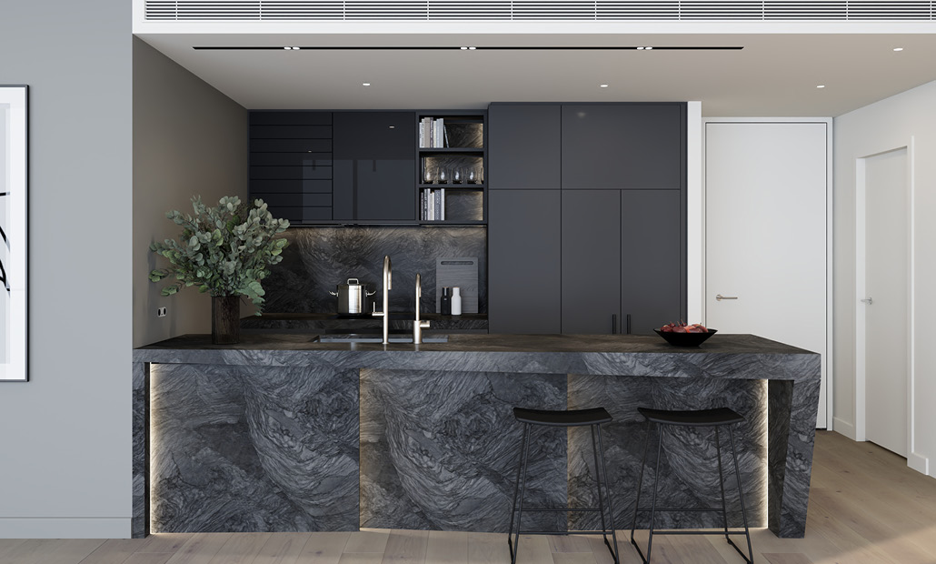 Designed for entertaining as well as for comfort and convenience each Trielle kitchen is highly sculptural, anchored by a faceted stone bench fitted with soft LED lighting.