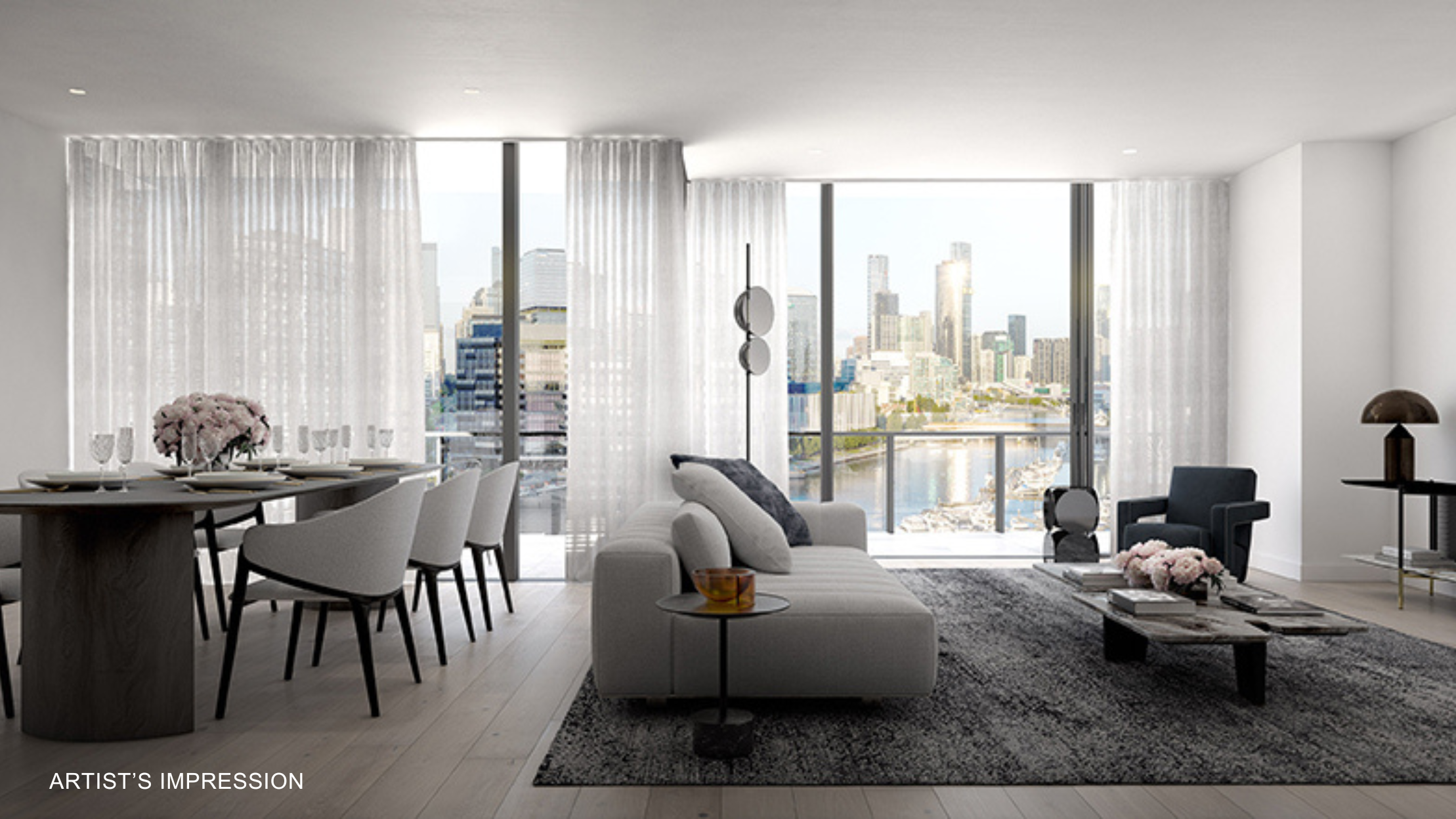 - Light-filled living seamlessly opens to an expansive east-facing balcony with views of the Yarra River, Marina YE and Melbourne city skyline
