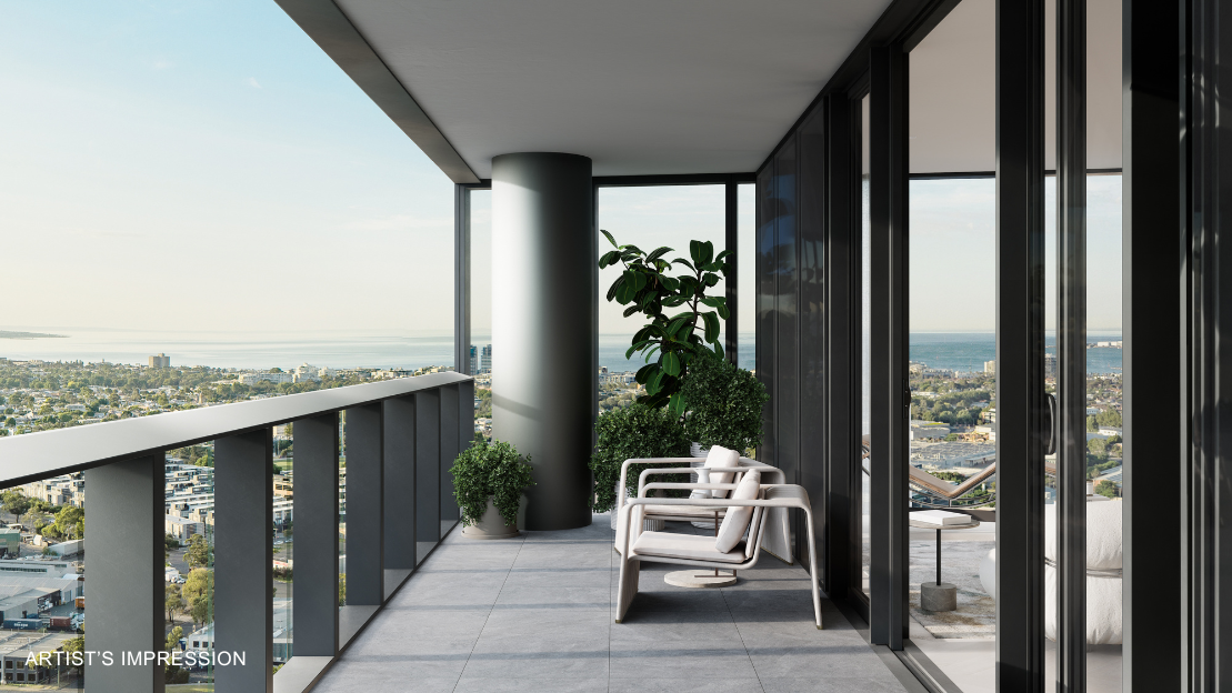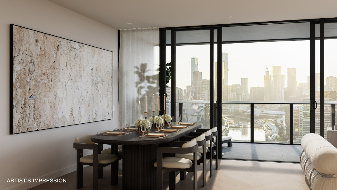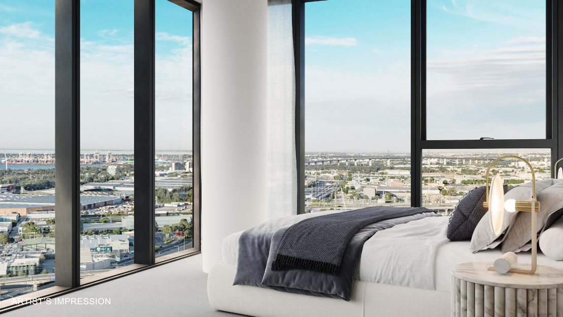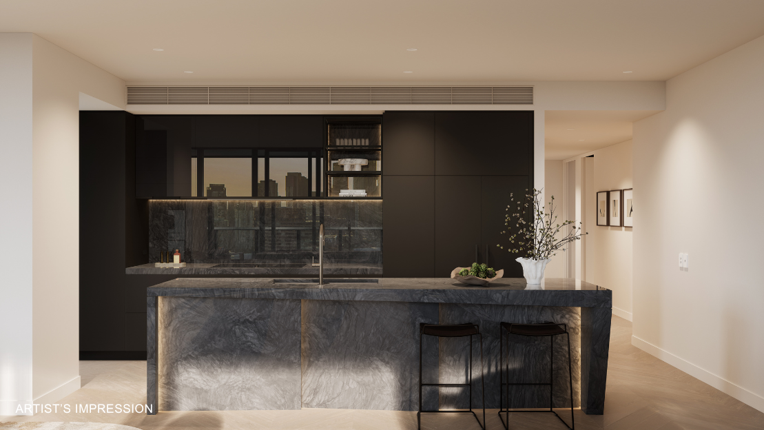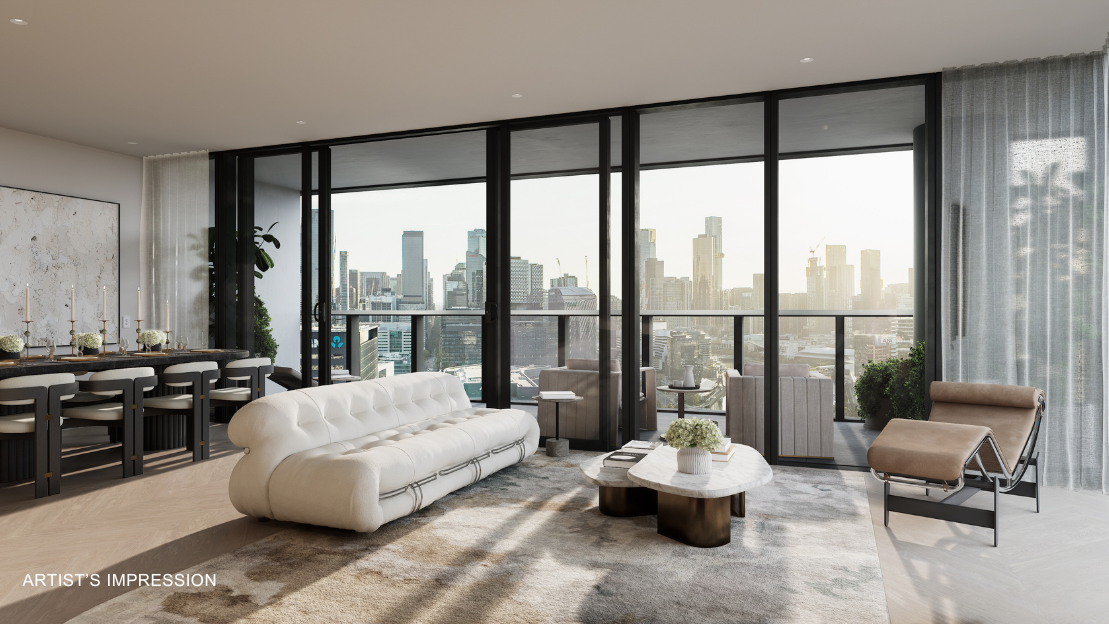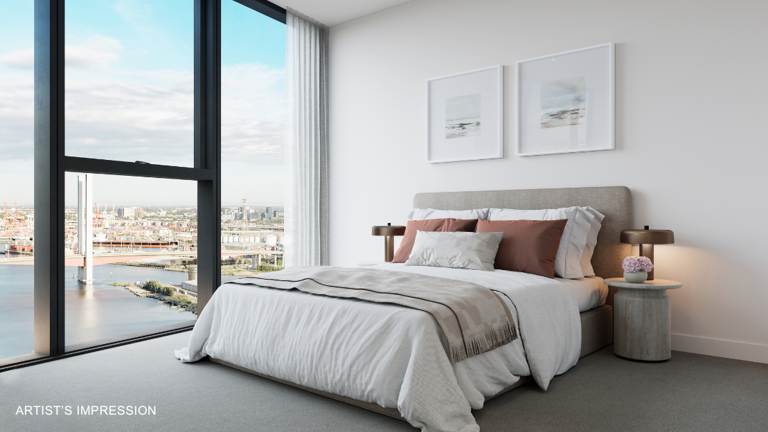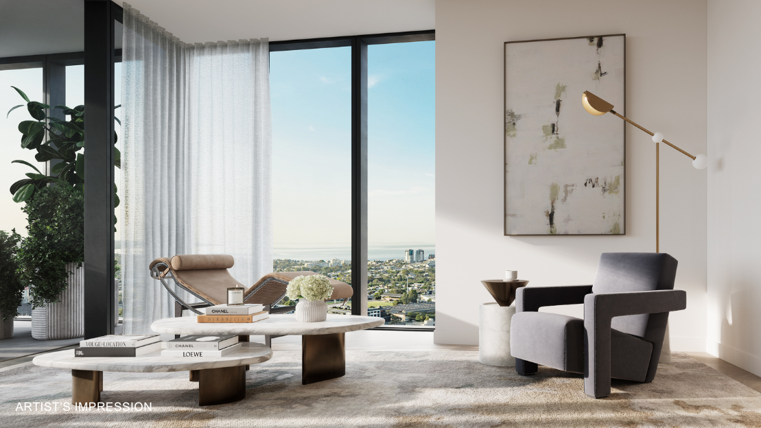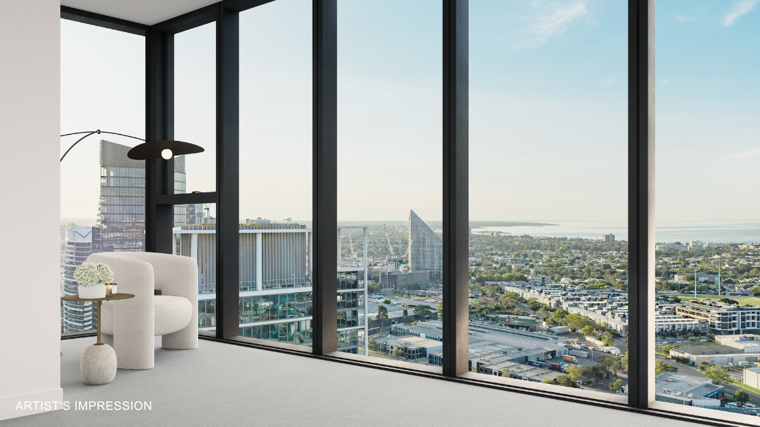 Artist's impression was produced prior to planning approval, statutory approval and commencement of construction and is subject to change. The information, image and artists' impression depicting interiors and exteriors are intended only as a guide and are not to be relied on as representative of the final product or the apartment type advertised. Furnishings are not included. Views depicted in this property listing are indicative only at approximately Level 31 and should not be relied upon as representative of any final views from any particular apartment. Purchasers should make their own enquiries as to the impact of any proposed surrounding development on any views. Photography is correct as at August 2022 and does not represent any future development that may occur in the area. The information provided herein is believed to be correct as at March 2025.